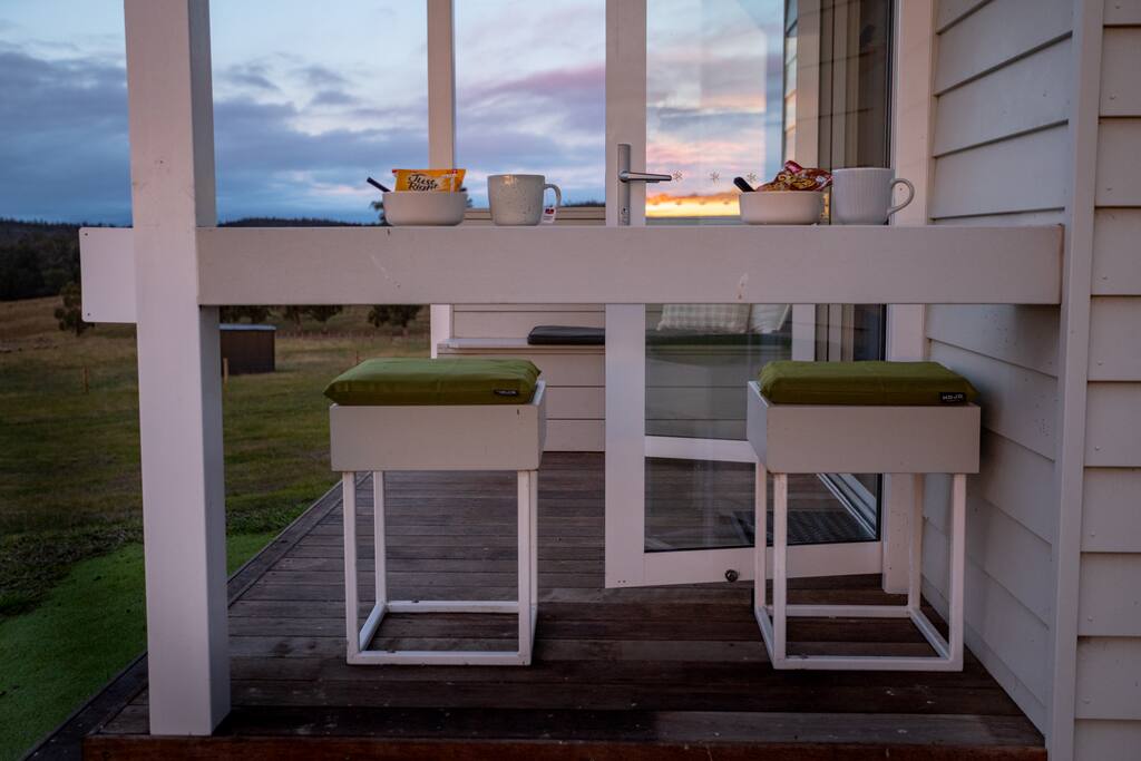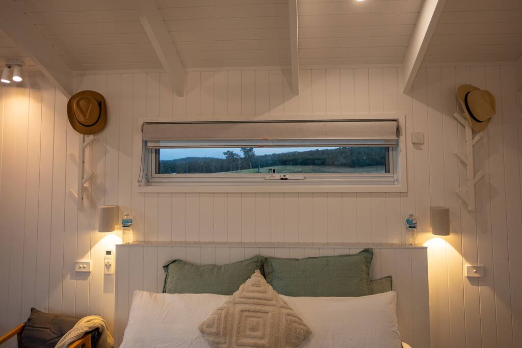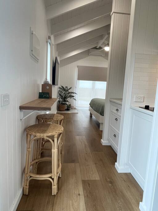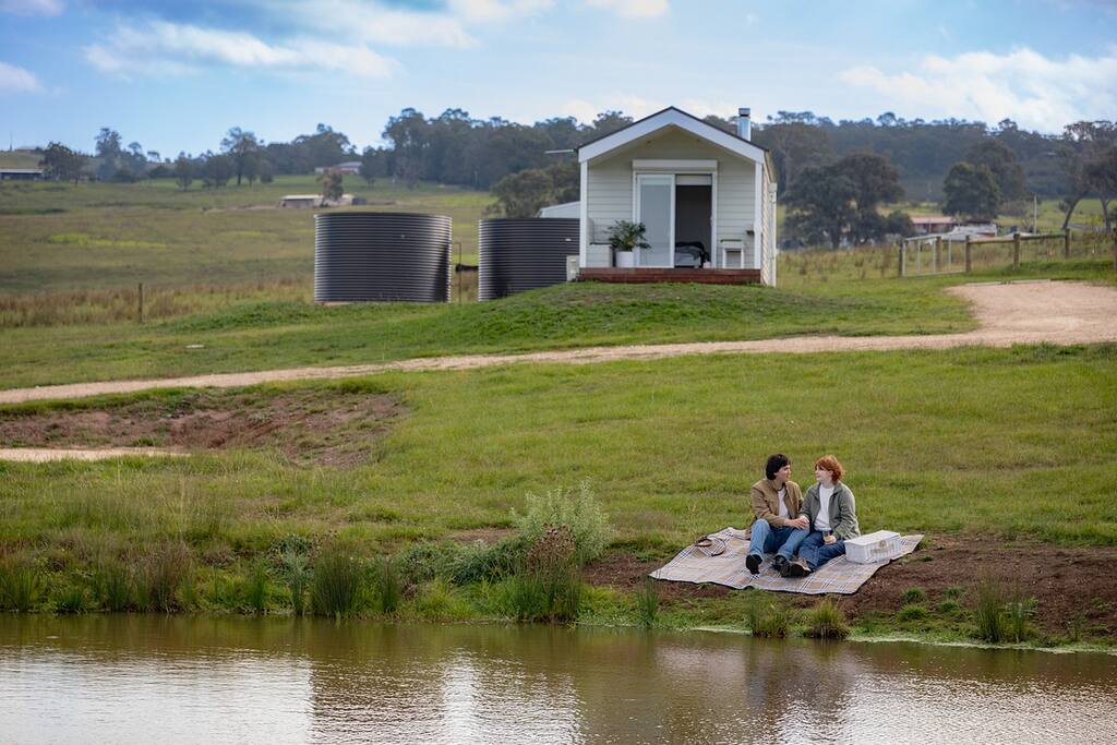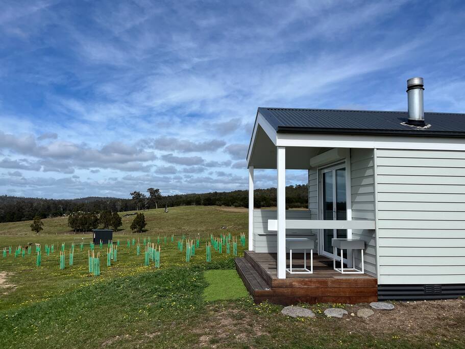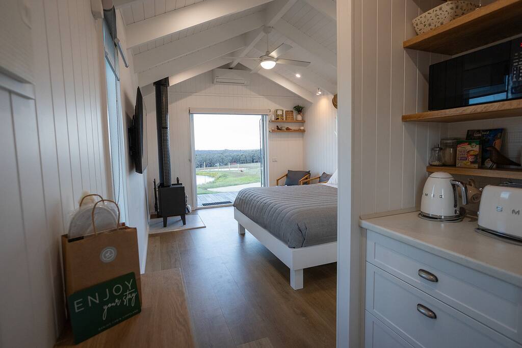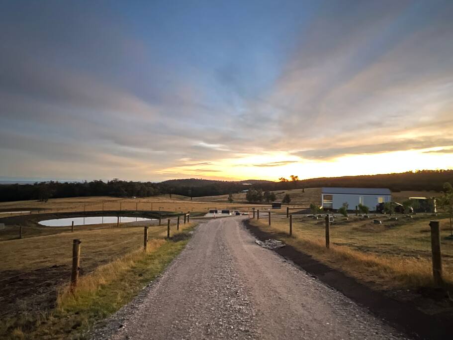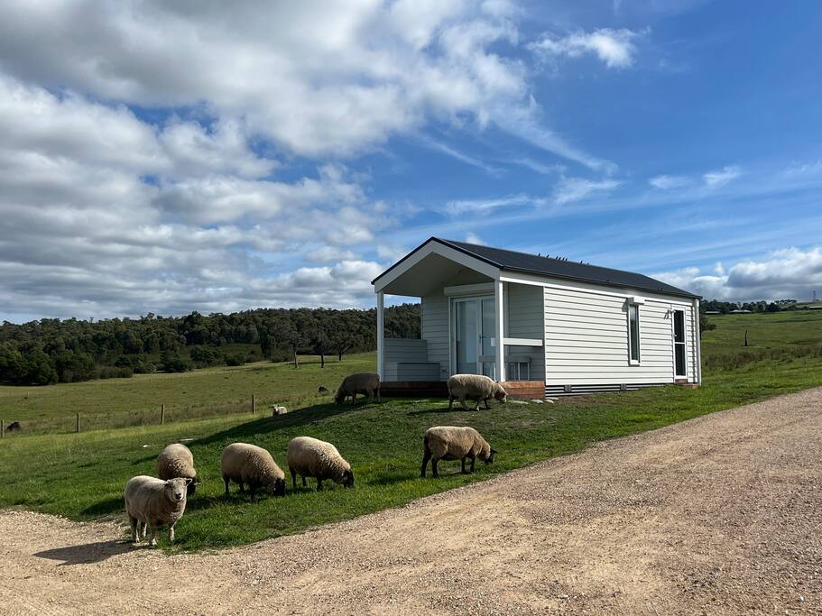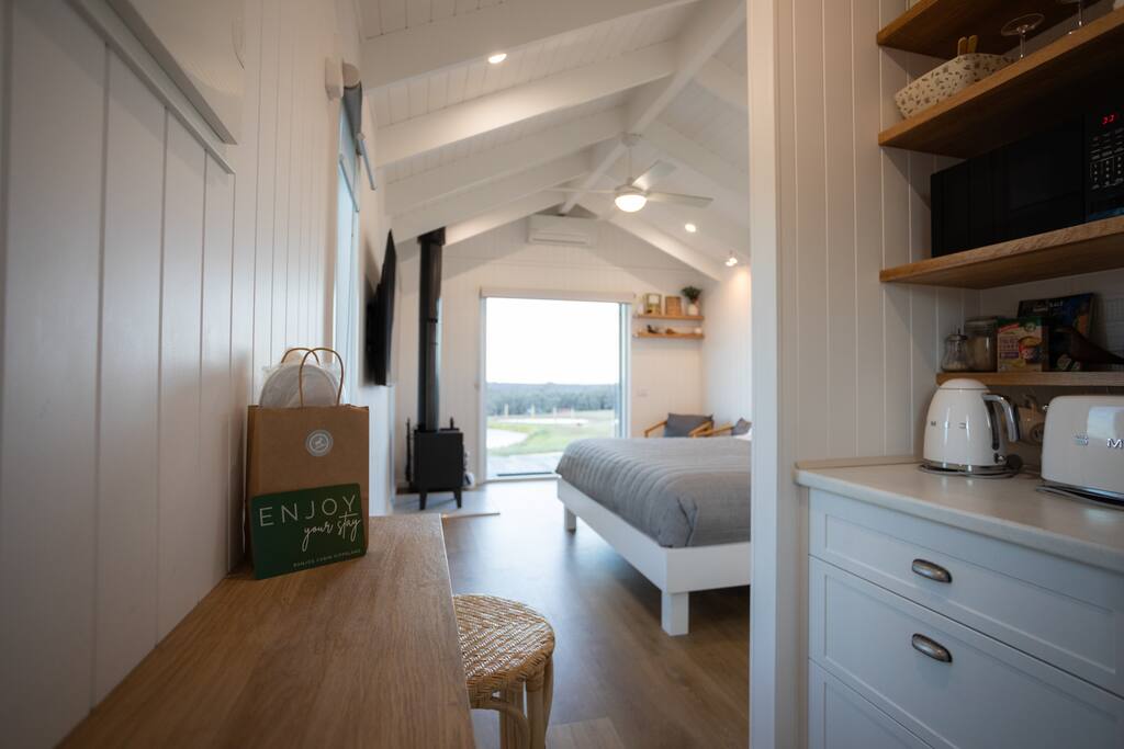 Step into this Hamptons-inspired hideaway, with soaring raked ceilings, French doors, and a bright, airy interior. Cool off under the ceiling fan or split system after sun-filled adventures, then unwind with a 55” Smart TV. The kitchenette features electric cooktop, slow cooker, toaster, kettle, microwave, coffee pod machine, and a ceramic water filter—everything you need for easy al fresco dining. Complimentary extras include tea, coffee, cereal, pancake mix, biscuits, primas and bottled water (still and sparkling). Tasting platters are a popular addition - available by request at additional cost. Perfect for birthdays, anniversaries or a romantic getaway. Message us after booking for details! Sleep deeply in the luxe king bed with premium linens, and refresh in your sparkling ensuite with fluffy towels, robes, complementary slippers, and goat milk soap. Outside, wander through the emerging food forest, meet our friendly Babydoll and Suffolk sheep, and admire the rare Appaloosa Mini Harlequin flock grazing nearby. Pause by the pond and pollinator gardens, where new life is taking root. Across the property, you’ll notice green plastic tree guards protecting young saplings - these help shield over 260 newly planted fruit and native trees from curious kangaroos and sheep as they establish. Together, they’ll form a thriving food forest and habitat for wildlife and pollinators, and a future ‘pick-your-own’ experience for guests. At dusk, enjoy 'pink hour' as you watch kangaroos, cattle and horses graze as sweeping views stretch from the valley to the high country. This is rustic tranquillity, modern comfort, and pure magic in Central Gippsland. Heyfield is our closest town, just 10 minutes away, with the Railway Hotel (great country hospitality and pub meals), IGA, fuel, chemist, and more. Larger regional centres, Port of Sale and Traralgon, are each about 25 minutes away, with charming country towns like Maffra, Briagolong, Rosedale, Tinamba and Cowwarr to explore along the way.