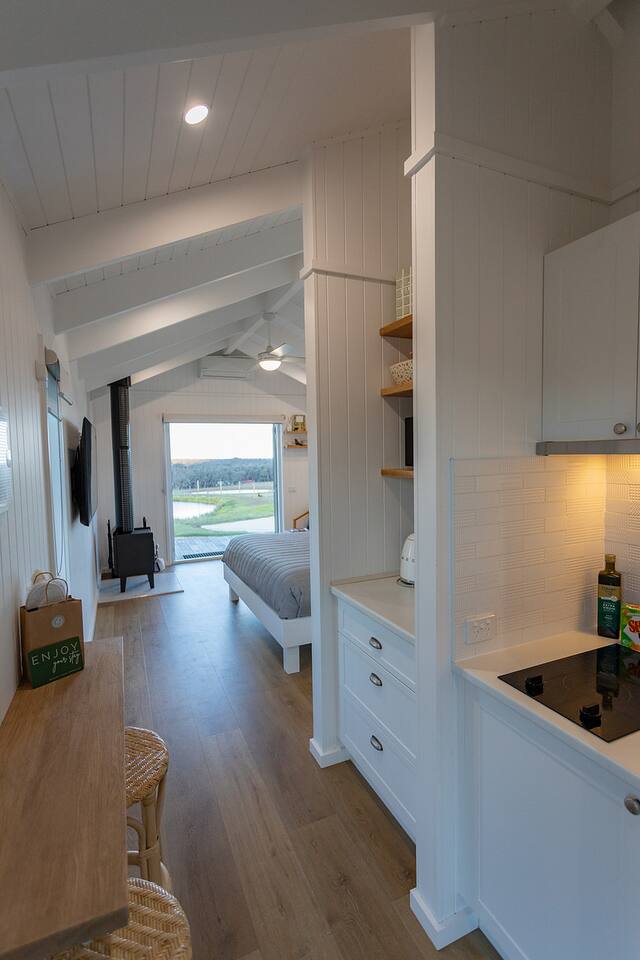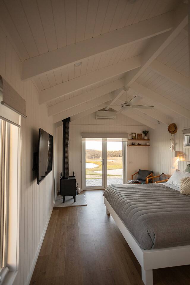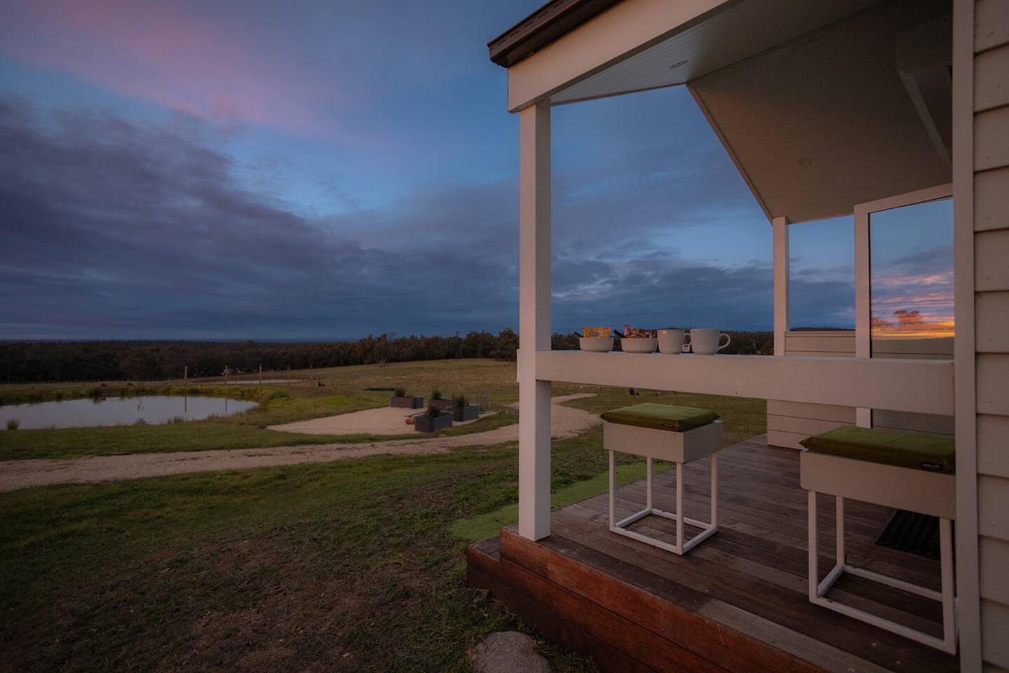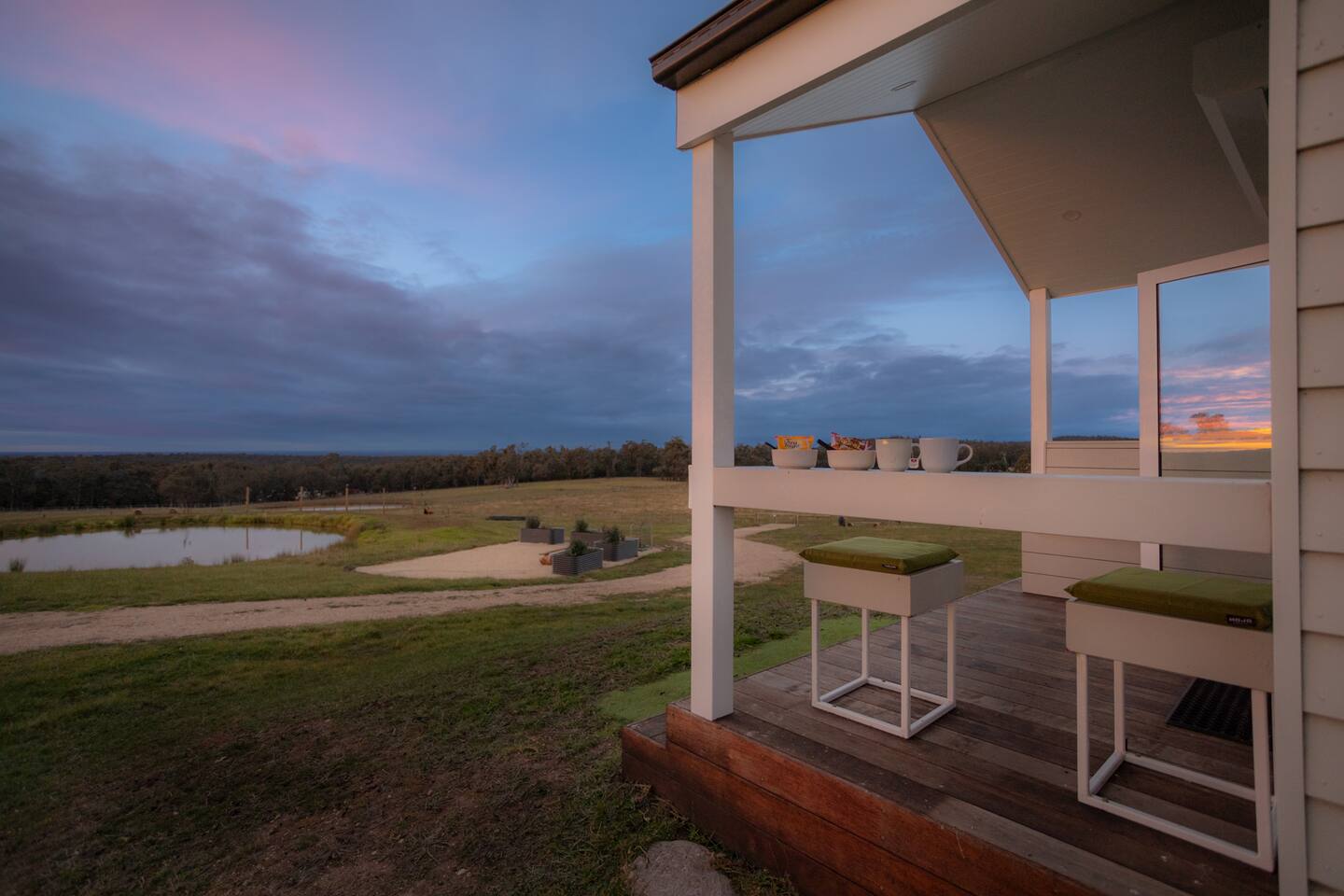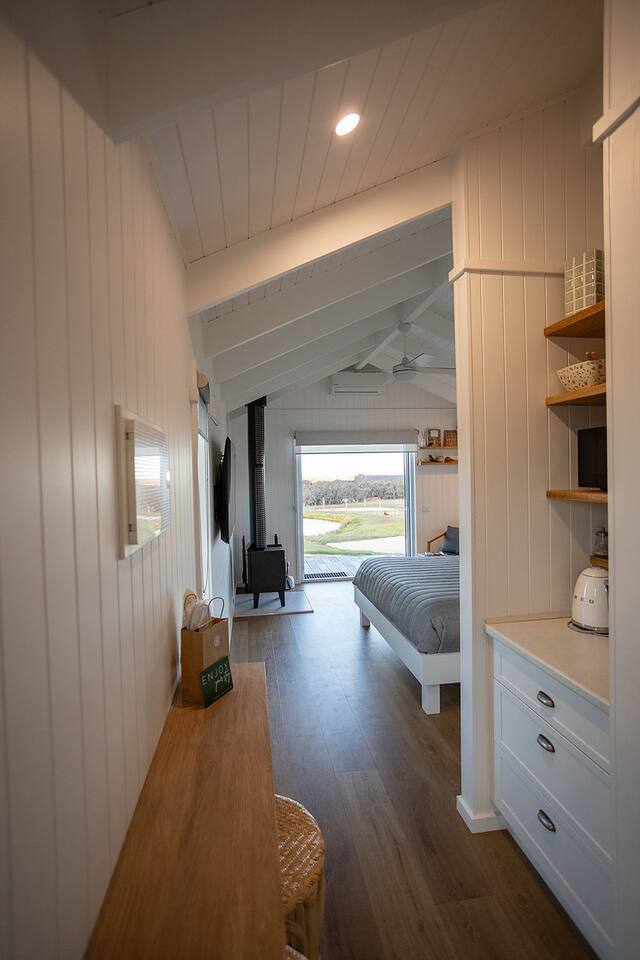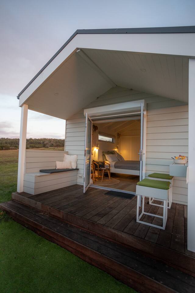 Set among rolling hills overlooking a wildlife pond, Banjo’s Cabin Gippsland offers a relaxed escape in Central Gippsland. Wake to sunny mornings at your outdoor brekkie bar, wander bush trails to nearby water holes or explore historic country towns. Enjoy Tinamba’s renowned dining, visit local wineries and breweries or settle into friendly country pubs. As evening falls, return for sunset drinks on the deck, spotting kangaroos as festoon lights reflect on the water beneath wide, starry skies.