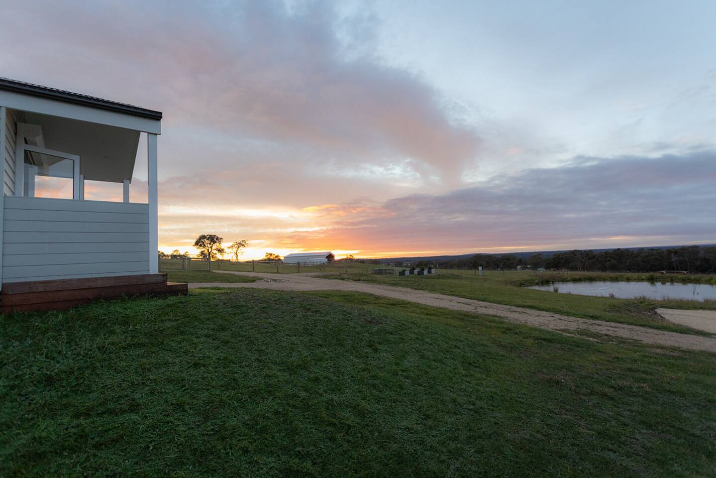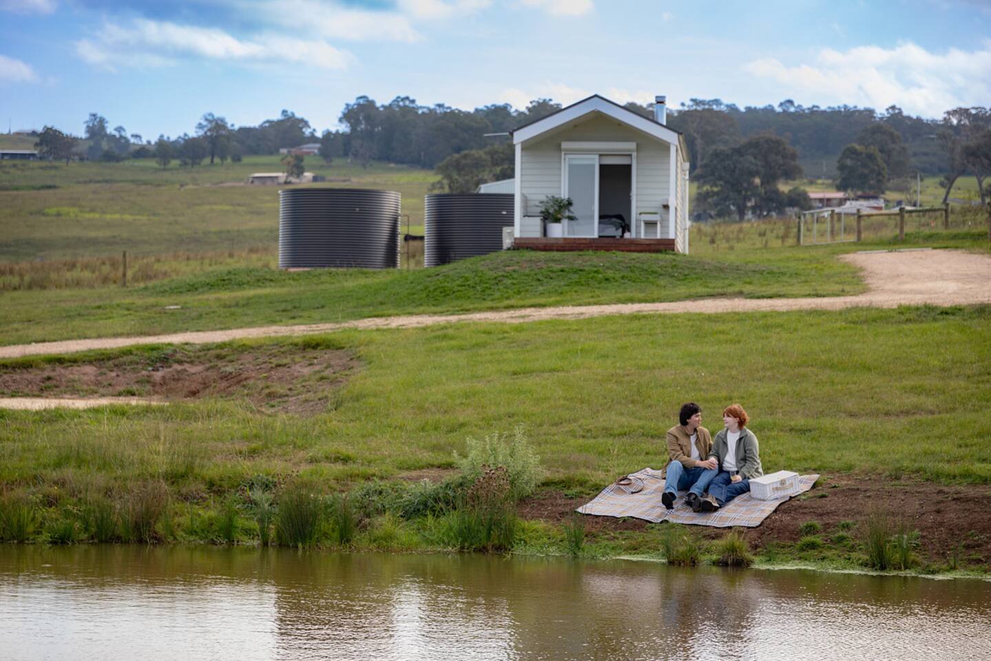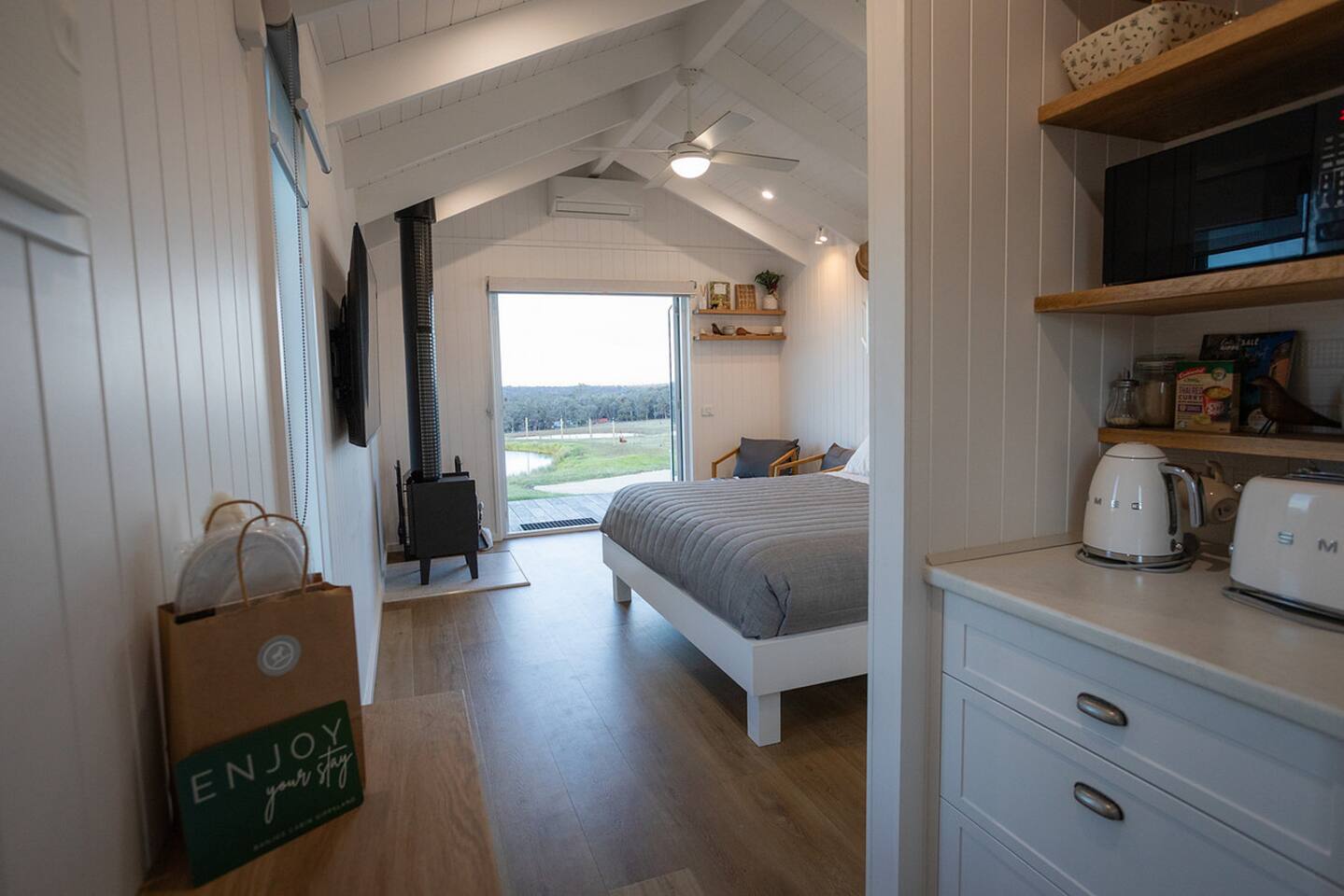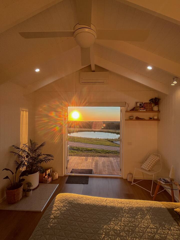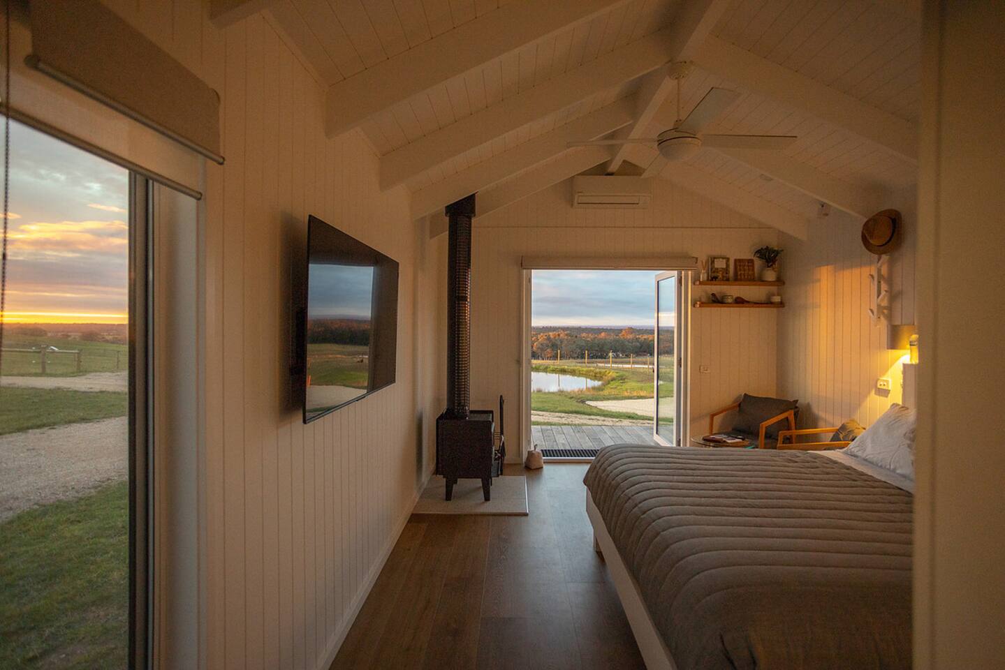 Set among rolling hills overlooking a wildlife pond, Banjo’s Cabin Gippsland offers a relaxed escape in Central Gippsland. Wake to sunny mornings at your outdoor brekkie bar, wander bush trails to nearby water holes or explore historic country towns. Enjoy Tinamba’s renowned dining, visit local wineries and breweries or settle into friendly country pubs. As evening falls, return for sunset drinks on the deck, spotting kangaroos as festoon lights reflect on the water beneath wide, starry skies.