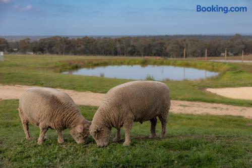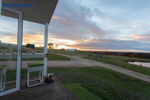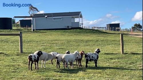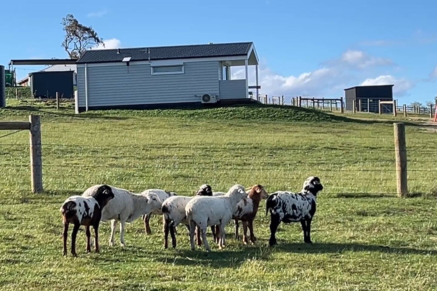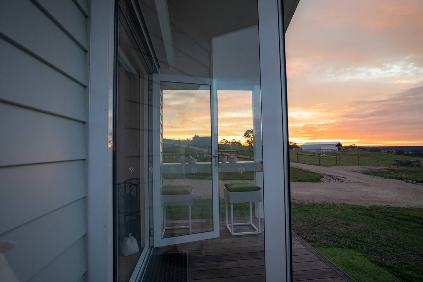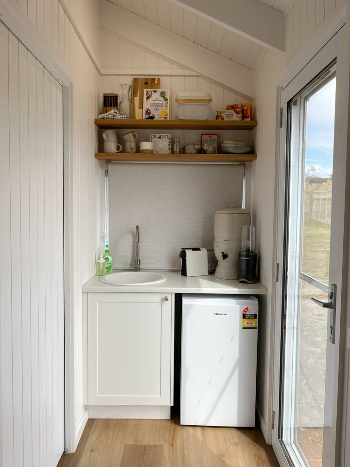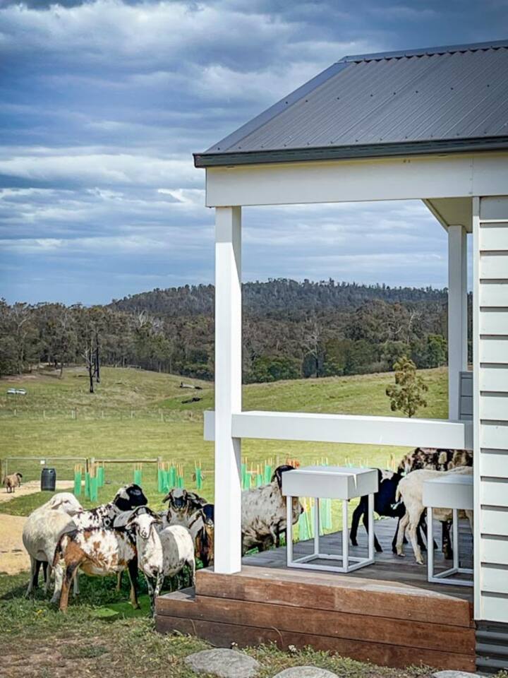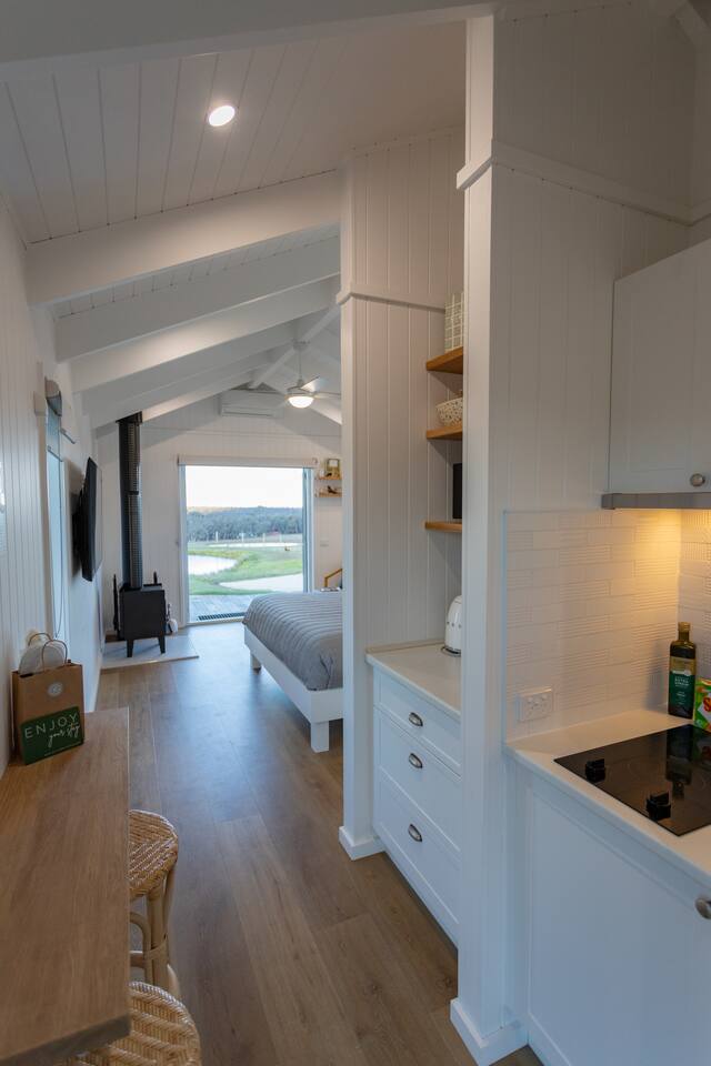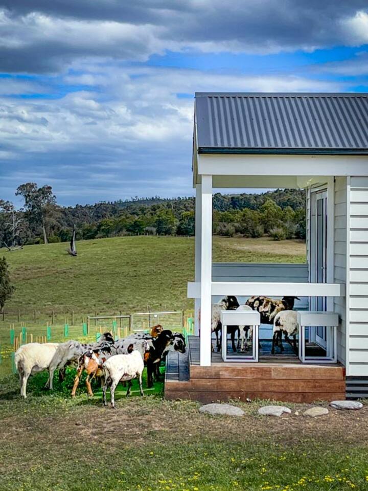 Step into this Hamptons-inspired hideaway featuring soaring raked ceilings, French doors, and a bright, airy interior. Stay comfortable with the ceiling fan or split system, then unwind with the 55” Smart TV after a day outdoors. The kitchenette includes an electric cooktop, slow cooker, toaster, kettle, microwave, coffee pod machine, and ceramic water filter—ideal for relaxed meals and alfresco dining. Optional tasting platters and additional guest services are available by request at an additional cost and are popular for birthdays, anniversaries, or romantic getaways. Sleep deeply in the luxe king bed with premium linens, and refresh in the ensuite with fluffy towels, robes, complimentary slippers, and goat milk soap. Outside, wander through the emerging food forest, meet friendly Babydoll and Suffolk sheep, and admire the Appaloosa Mini Harlequin flock grazing nearby. Around the pond and pollinator gardens, new plantings are establishing to create future habitat and a seasonal pick-your-own experience. At dusk, enjoy ‘pink hour’ as kangaroos, cattle, and horses graze across the valley with sweeping views toward the high country. Heyfield is just 10 minutes away, offering a welcoming country pub, IGA, fuel, and essentials. Larger regional centres including Sale and Traralgon are around 25 minutes away, with charming towns such as Maffra, Briagolong, Rosedale, Tinamba, and Cowwarr nearby.